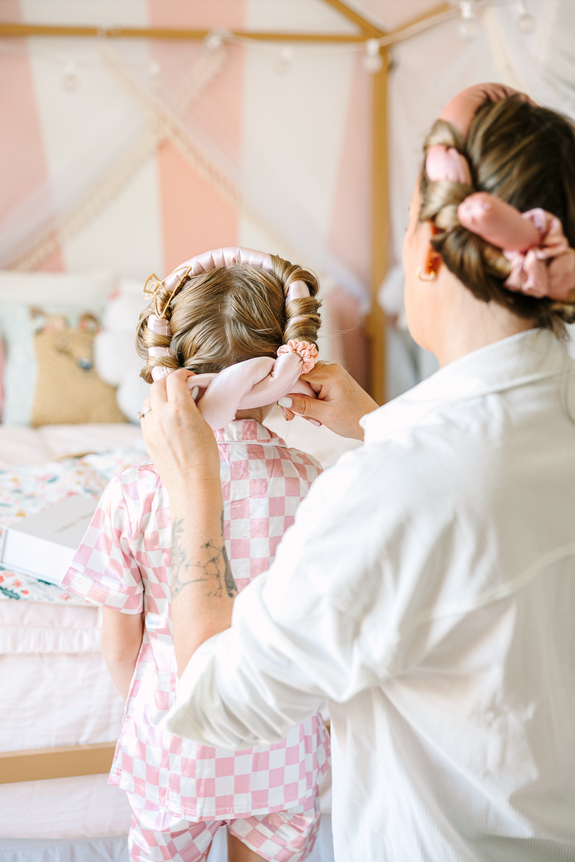 I created this Luxury line of Silk based products to elevate the way you treat not only your hair, but your whole self. Seeded by the need to help my preemie daughter revive her damaged and brittle hair, I designed my own 100% Mulberry Silk heatless Curlers, Scrunchies, Pillow Cases, Hair Oils, Sleep Mask and SO much more. And I'm beyond excited to share this line with you too!